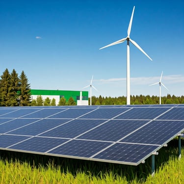 A landscape featuring a large solar panel array in the foreground, with a modern wind turbine to the left. Behind the renewable energy installations, an industrial facility with multiple chimneys and storage tanks is visible under a clear blue sky.
