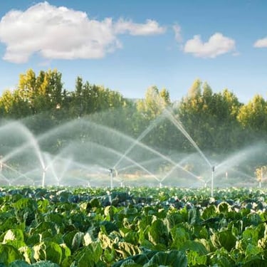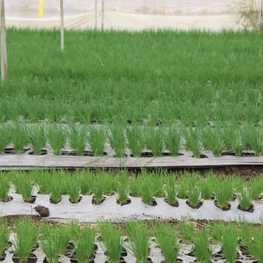 A lush green agricultural field with men and women working amidst the crops. The landscape is dotted with palm trees and a distant mountain range under a clear sky. Various poles are erected throughout the field, and there are signs of water irrigation.